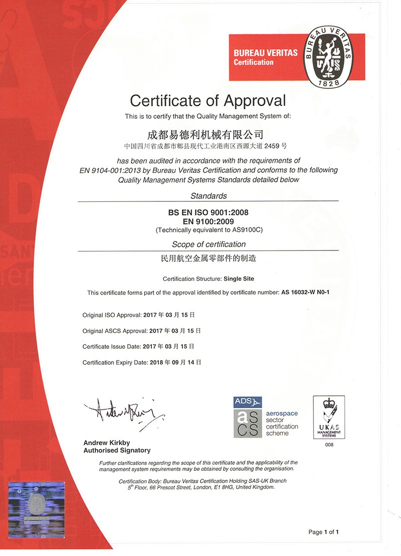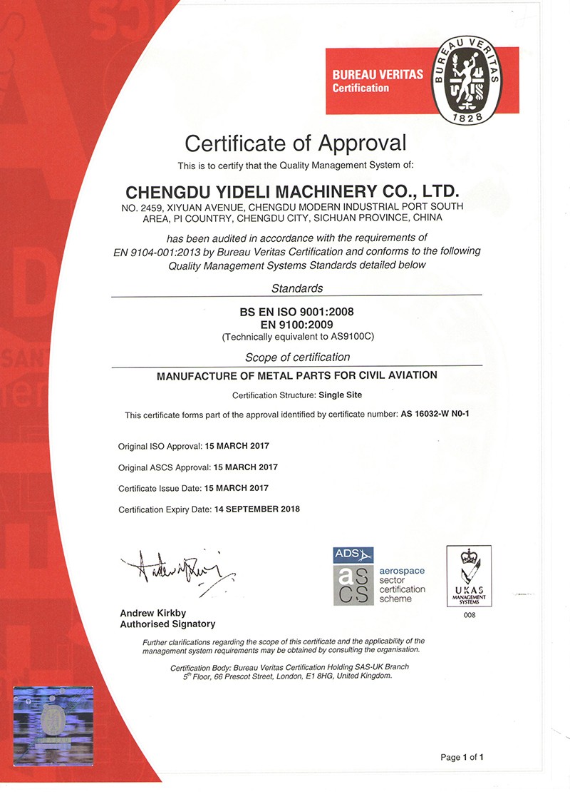 Congratulation--Yideli has won the certificate of AS9100